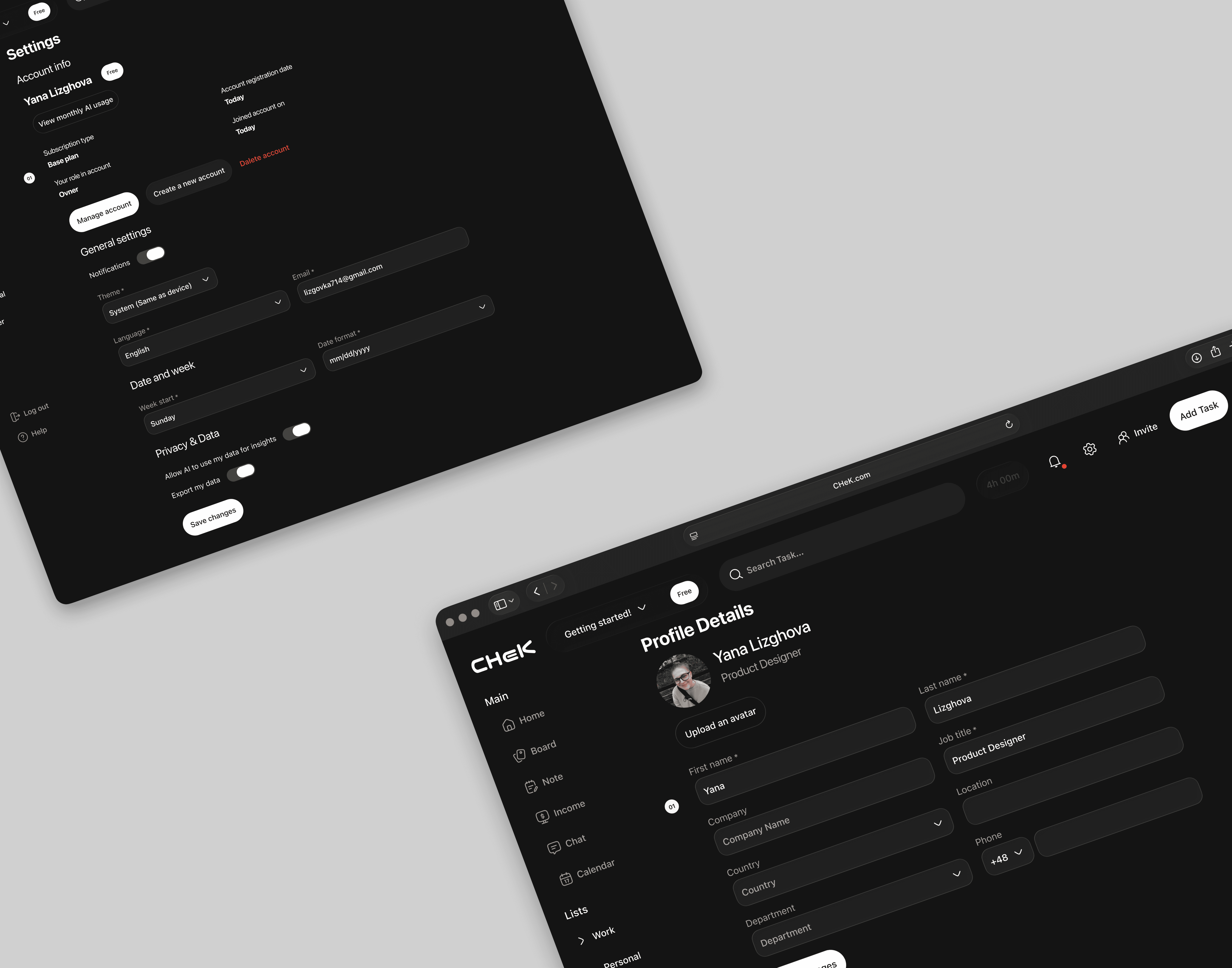 Profile and Settings. Sure — you can’t do without this, and in most apps it looks pretty similar. But HERE, like in every flow, we’ve filtered out elements and metrics that users don’t actually use. Only what’s necessary. This is probably my slogan (haha) — but honestly, no joke, it’s so nothing gets in the way of work.