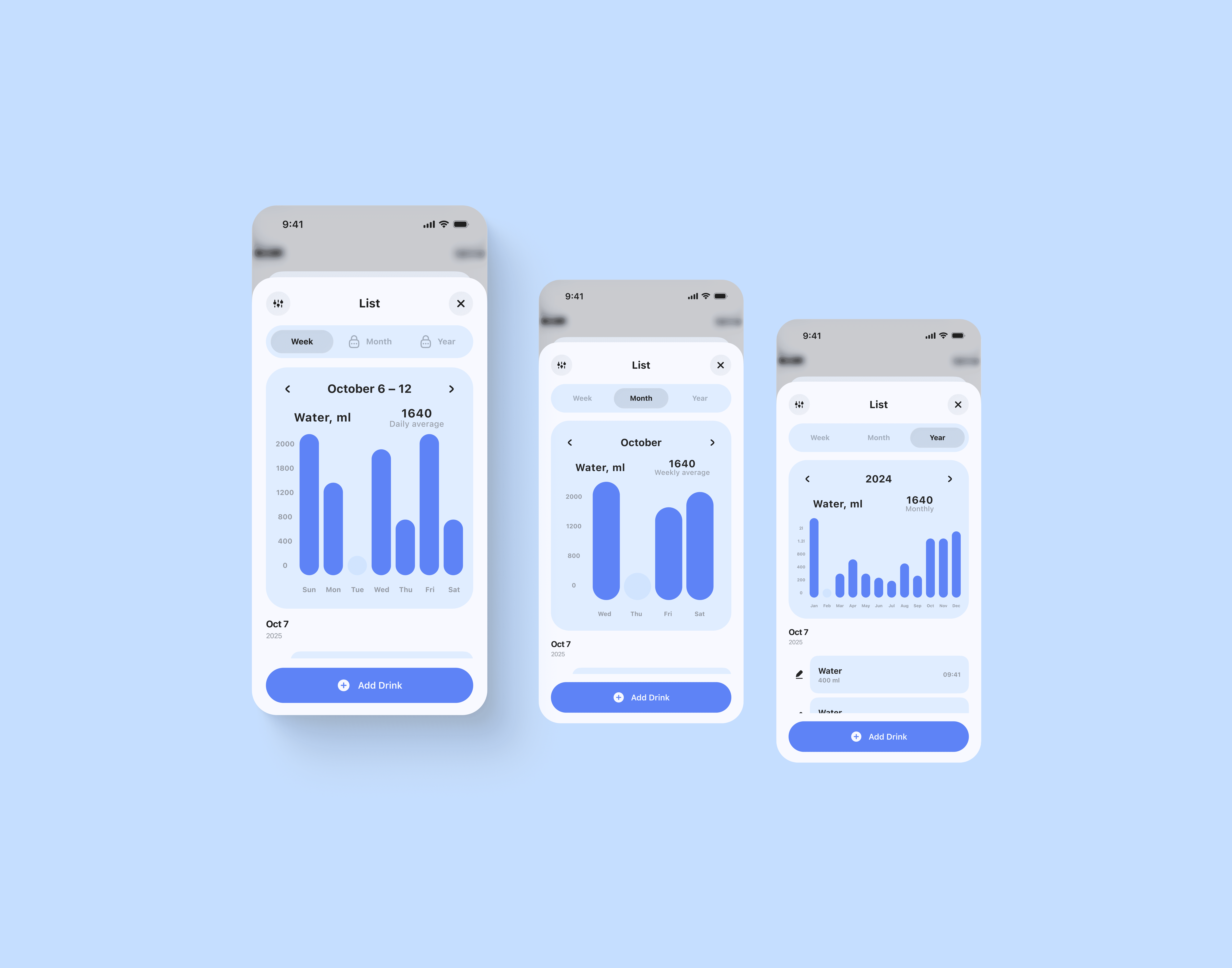 Besides that, on the same tab, you can see a full list with a specific drink or just water, including amount and time – edit any entry, and even add a drink if it’s already been logged here.