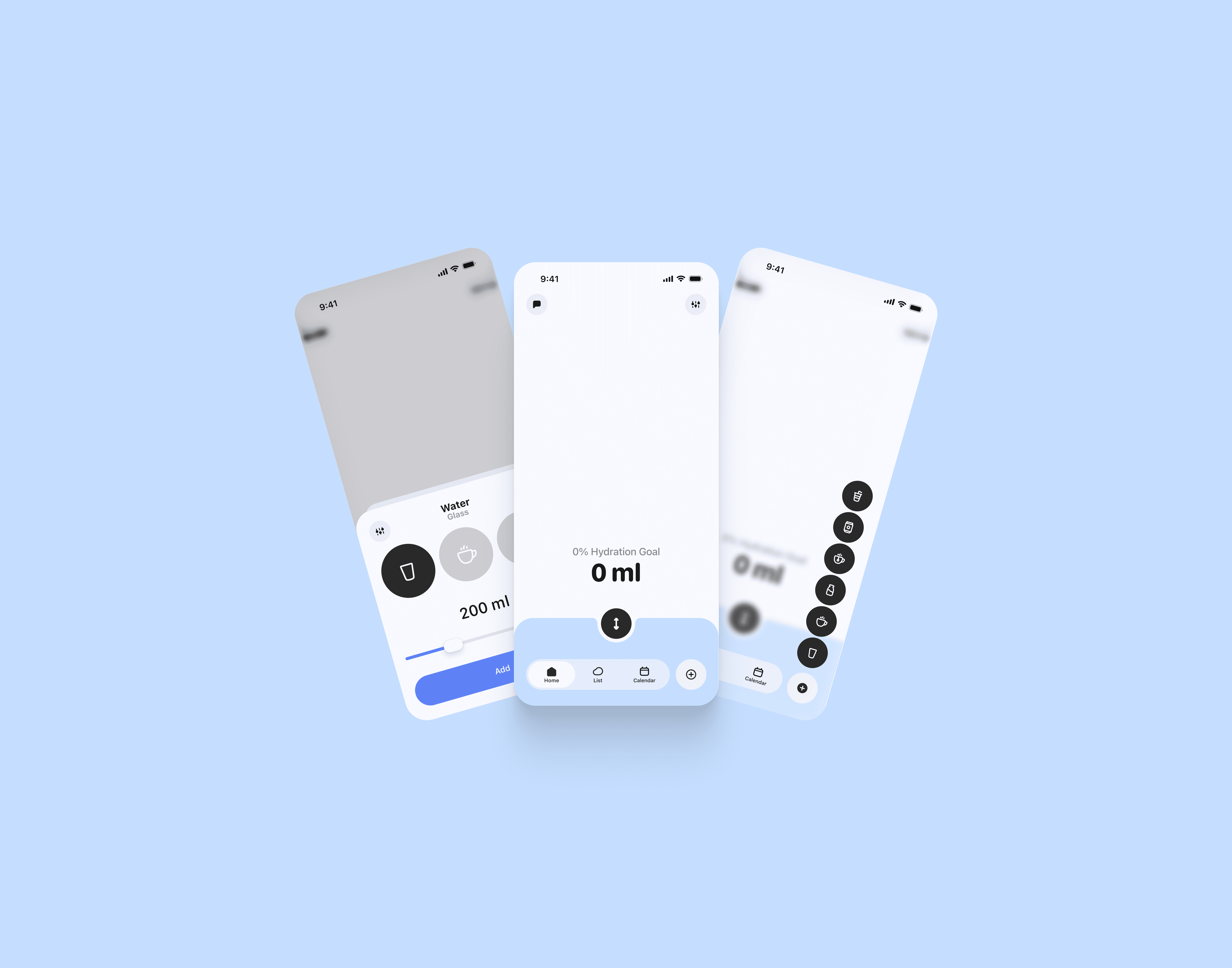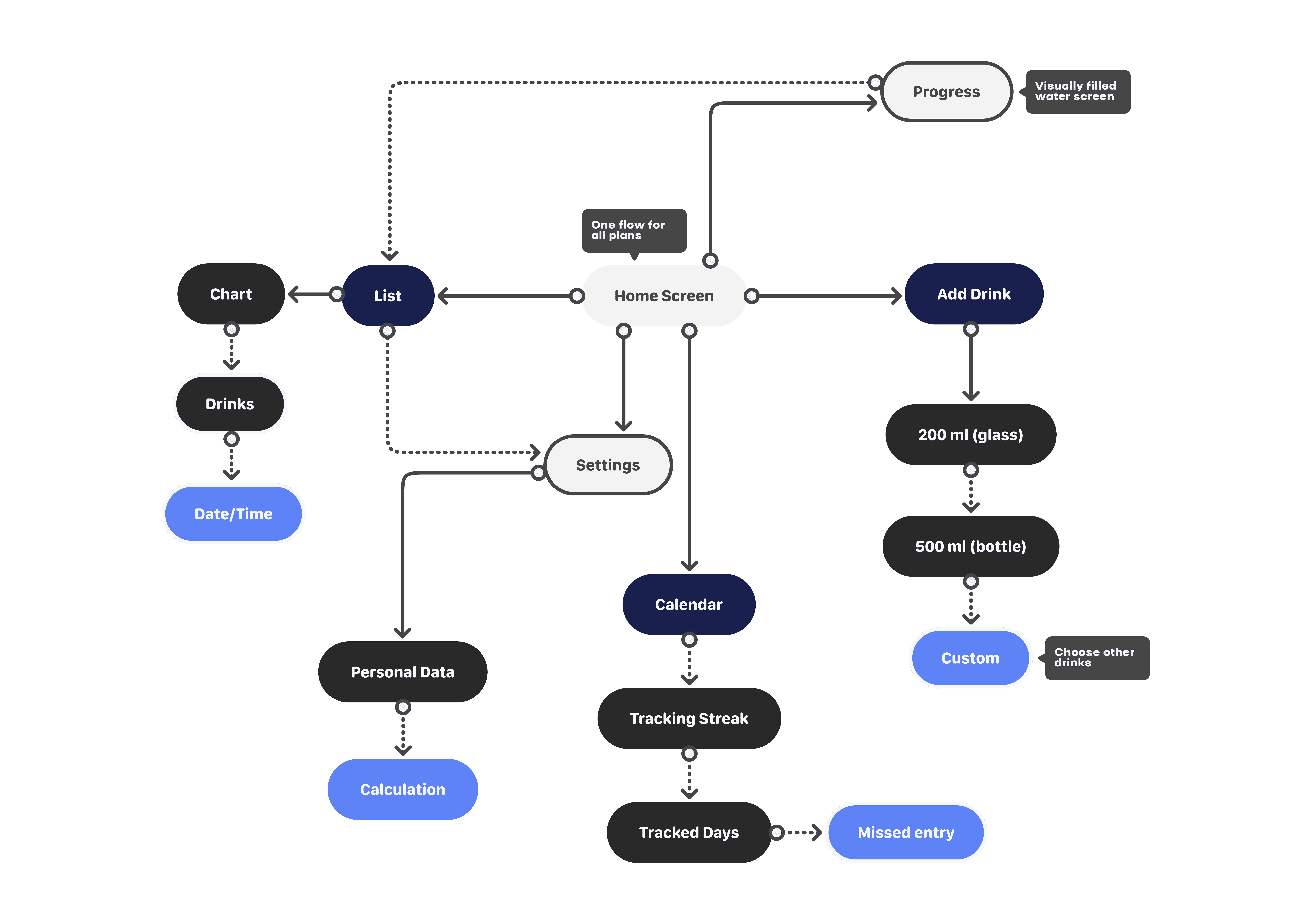 And almost lastly, I want to mention the settings, where the user has the standard set of tracker functions, plus the option to recalculate their daily target, set wake-up and end-of-day times, and choose when to send water reminder notifications (if enabled).