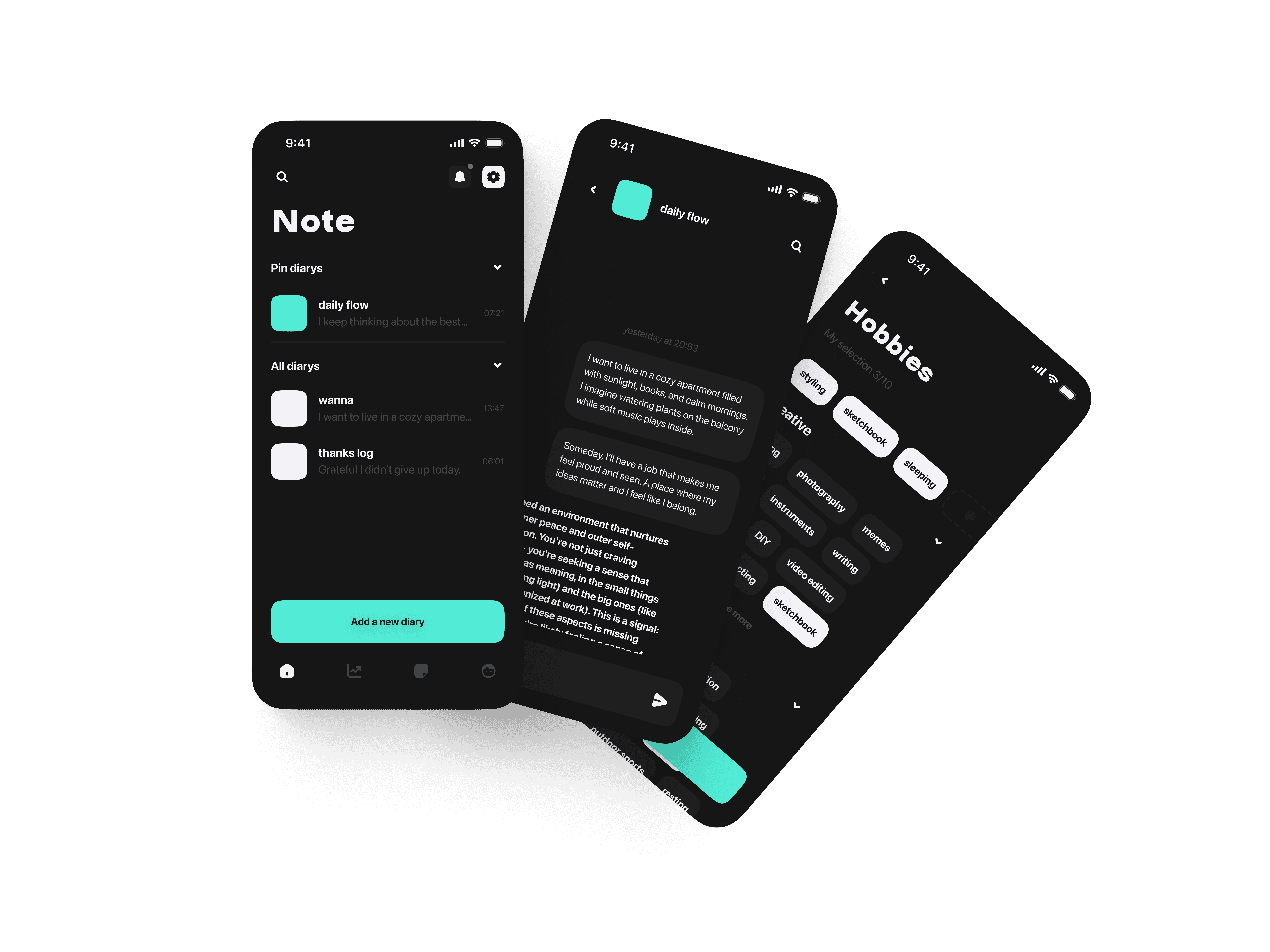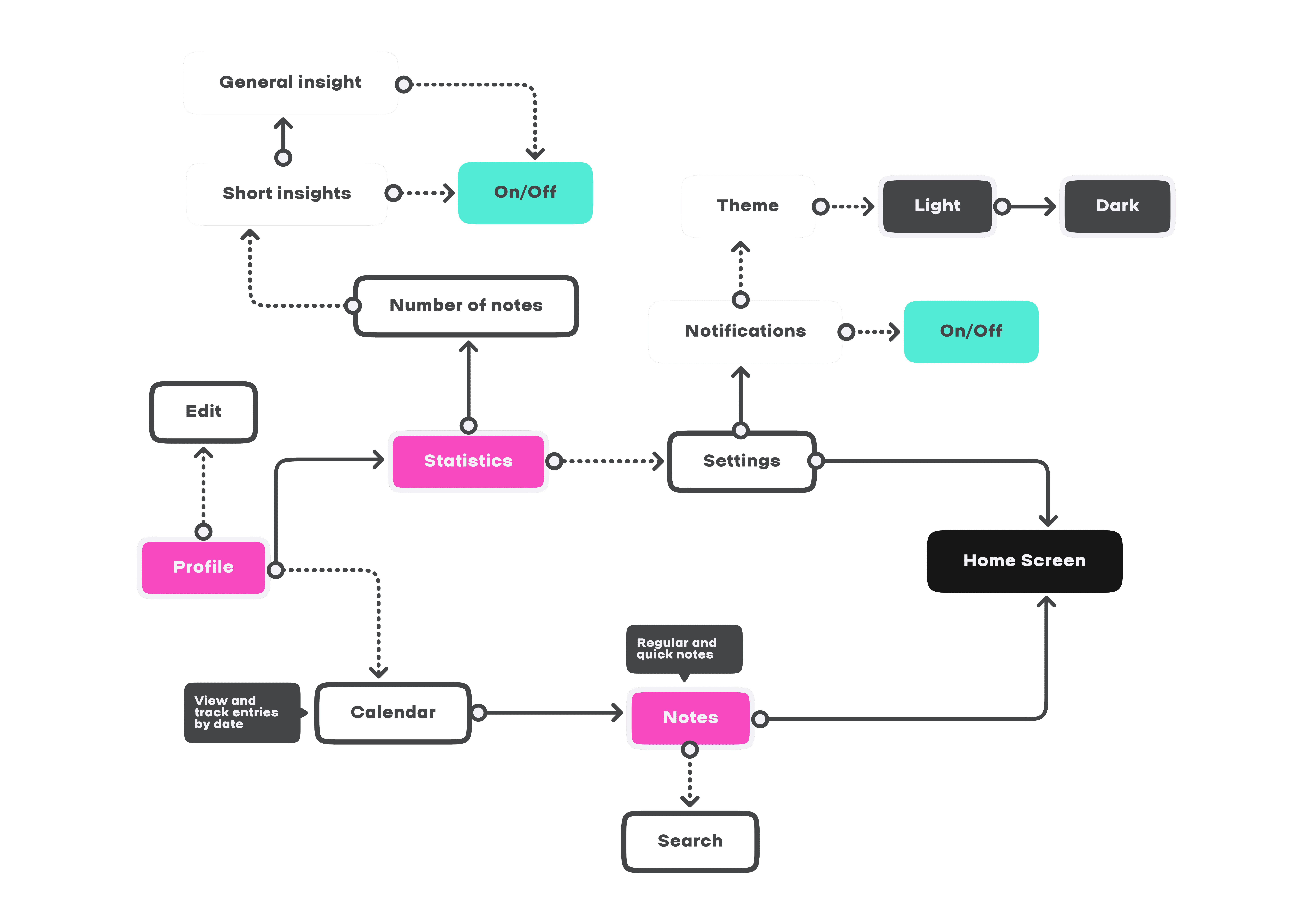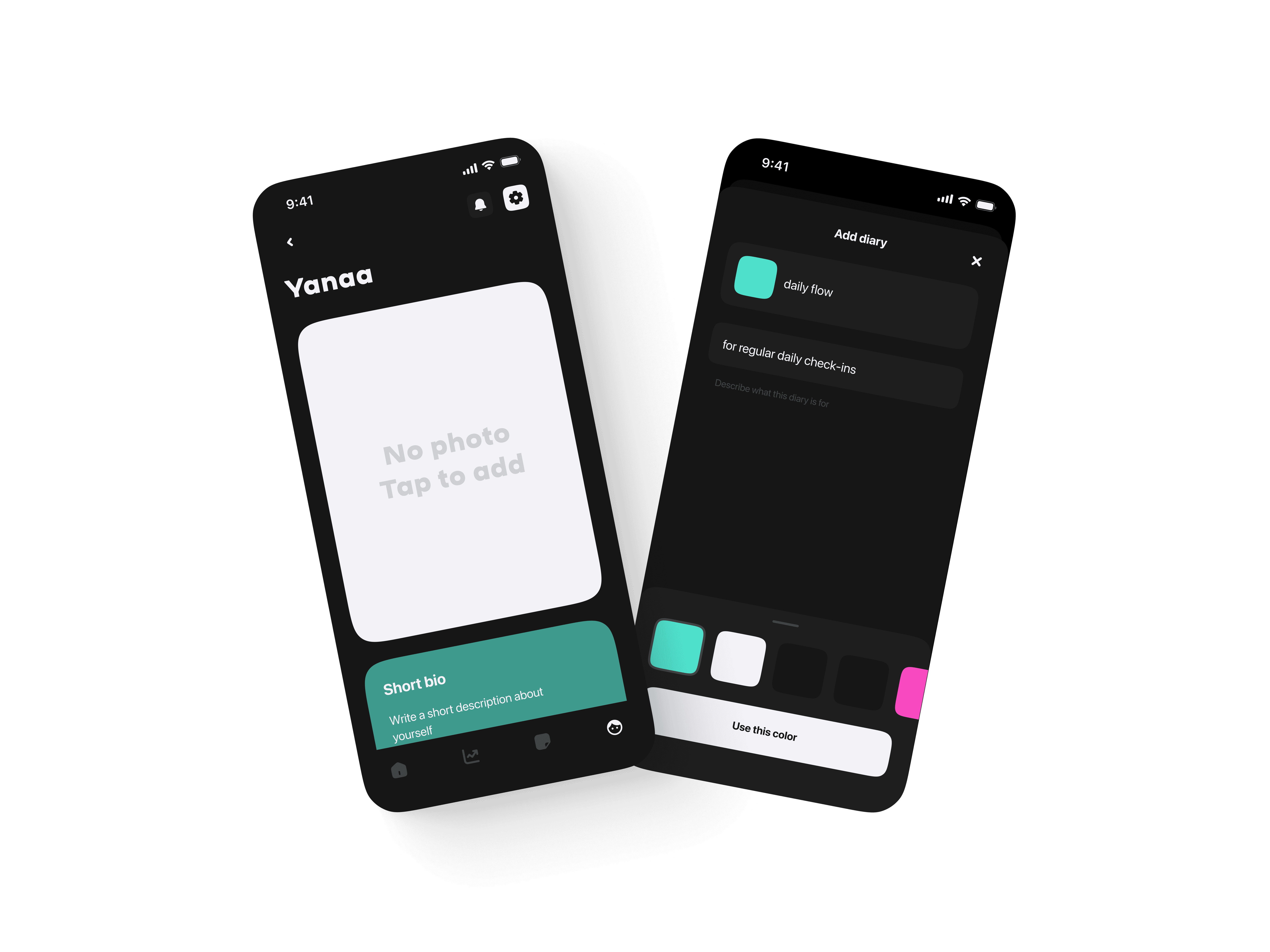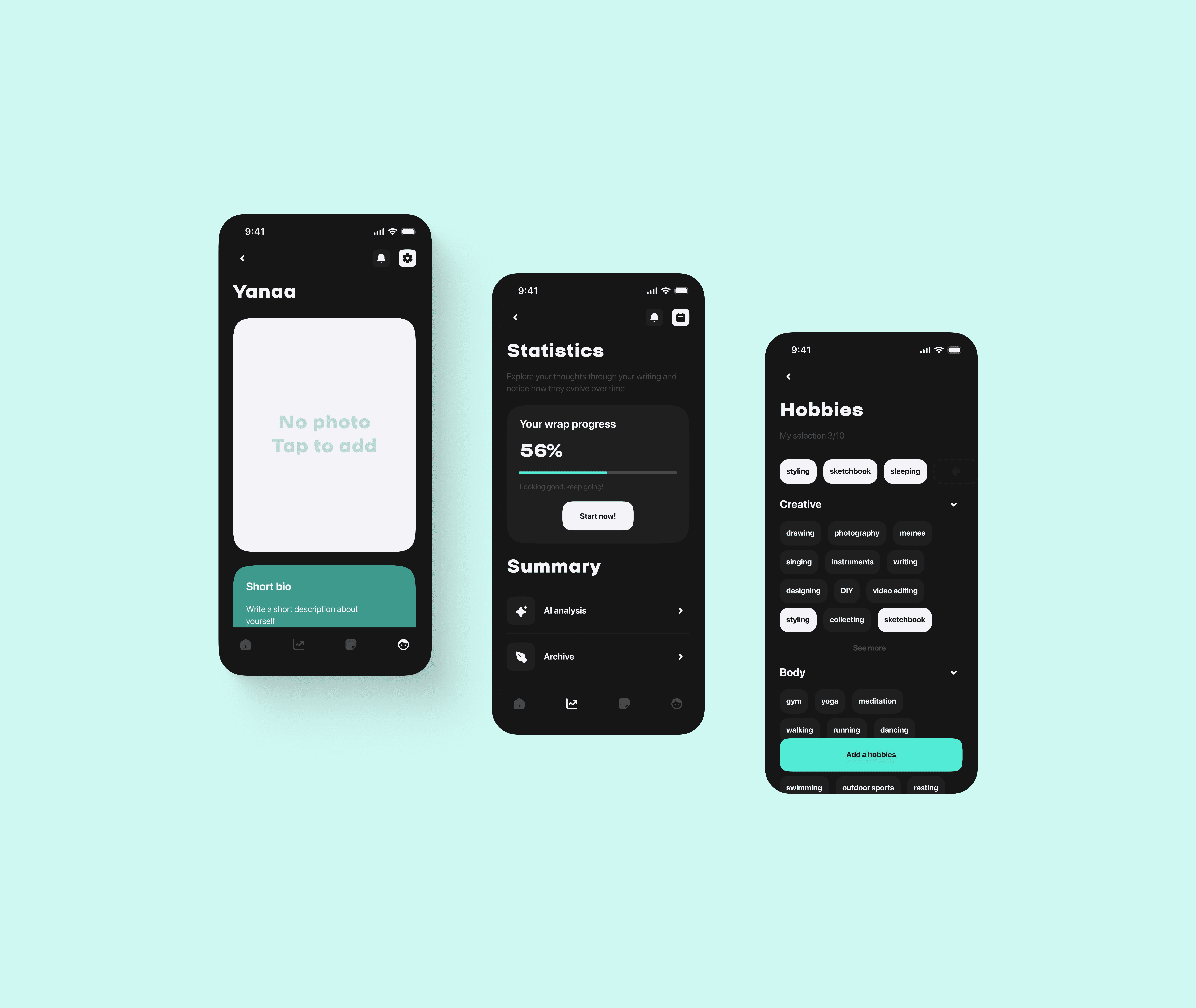 Each user can choose a theme they use all the time (dark / light), a separate profile setup flow, where the user can give more info about themselves — so AI provides the maximum quality of insights /